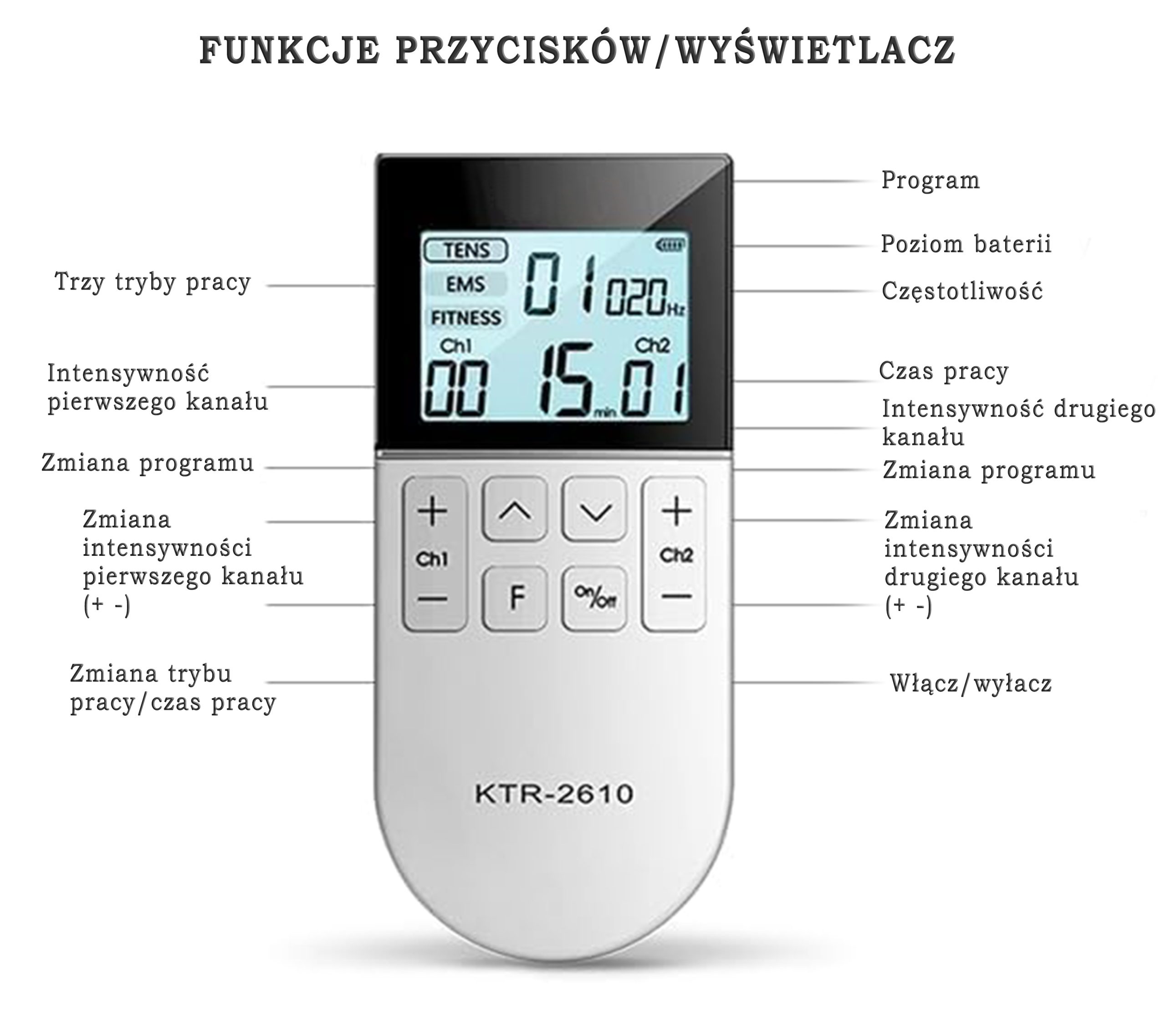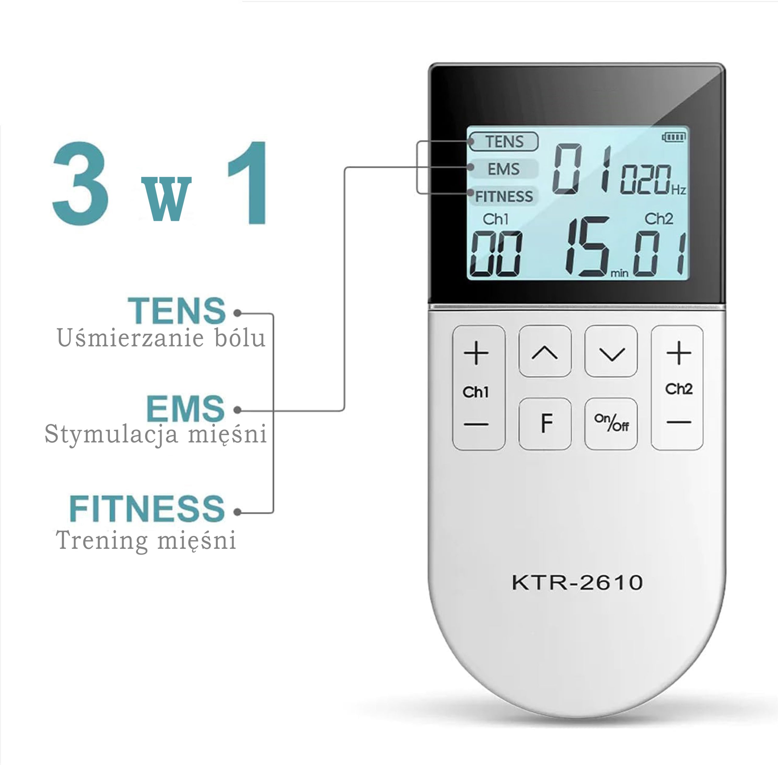 Pangao KTR-2610 to nowoczesny, wielofunkcyjny elektrostymulator przeznaczony do uśmierzania bólu, rozluźniania mięśni oraz wspomagania treningu mięśniowego. Urządzenie łączy w sobie funkcje TENS, EMS oraz FITNESS, dzięki czemu sprawdzi się zarówno w codziennej regeneracji, jak i podczas ćwiczeń.